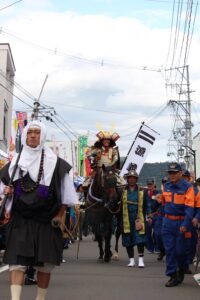 福島県国見町で行われた「第28回義経まつり」にて、弊社営業部の三浦が「義経公行列」の弁慶役に選ばれ、源義経役の中山優馬さん、静御前役の優希美青さん、一般武者に扮した地元住民の皆さんらとともに、藤田商店街を練り歩きました。